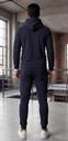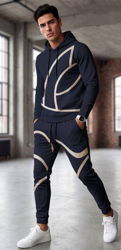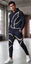 This modern, urban-style tracksuit features a sleek and athletic dThe standout feature of this tracksuit is the bold white geometric line design that spans across both the hoodie and pants. The lines are thick and curved, creating a dynamic, abstract pattern that gives the outfit a futuristic, streetwear-inspired aesthetic. The design appears continuous, starting from the chest area and flowing down through the pants, suggesting a unified and visually striking outfit.esign. The set includes a Navy Blue hoodie and matching jogger pants, both made from a smooth, fitted fabric that contours the body for a streamlined look.Hoodie: Drawstring hood, long sleeves, fitted cuffs, and a modern tailored fit.Joggers: Elastic waistband with drawstring, ribbed cuffs at the ankles, and a slim, tapered leg.