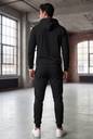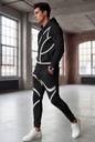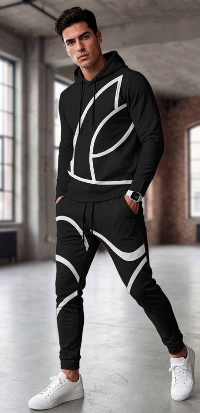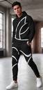 This modern, urban-style tracksuit features a sleek and athletic dThe standout feature of this tracksuit is the bold white geometric line design that spans across both the hoodie and pants. The lines are thick and curved, creating a dynamic, abstract pattern that gives the outfit a futuristic, streetwear-inspired aesthetic. The design appears continuous, starting from the chest area and flowing down through the pants, suggesting a unified and visually striking outfit.esign. The set includes a black hoodie and matching jogger pants, both made from a smooth, fitted fabric that contours the body for a streamlined look.Hoodie: Drawstring hood, long sleeves, fitted cuffs, and a modern tailored fit.Joggers: Elastic waistband with drawstring, ribbed cuffs at the ankles, and a slim, tapered leg.