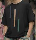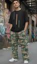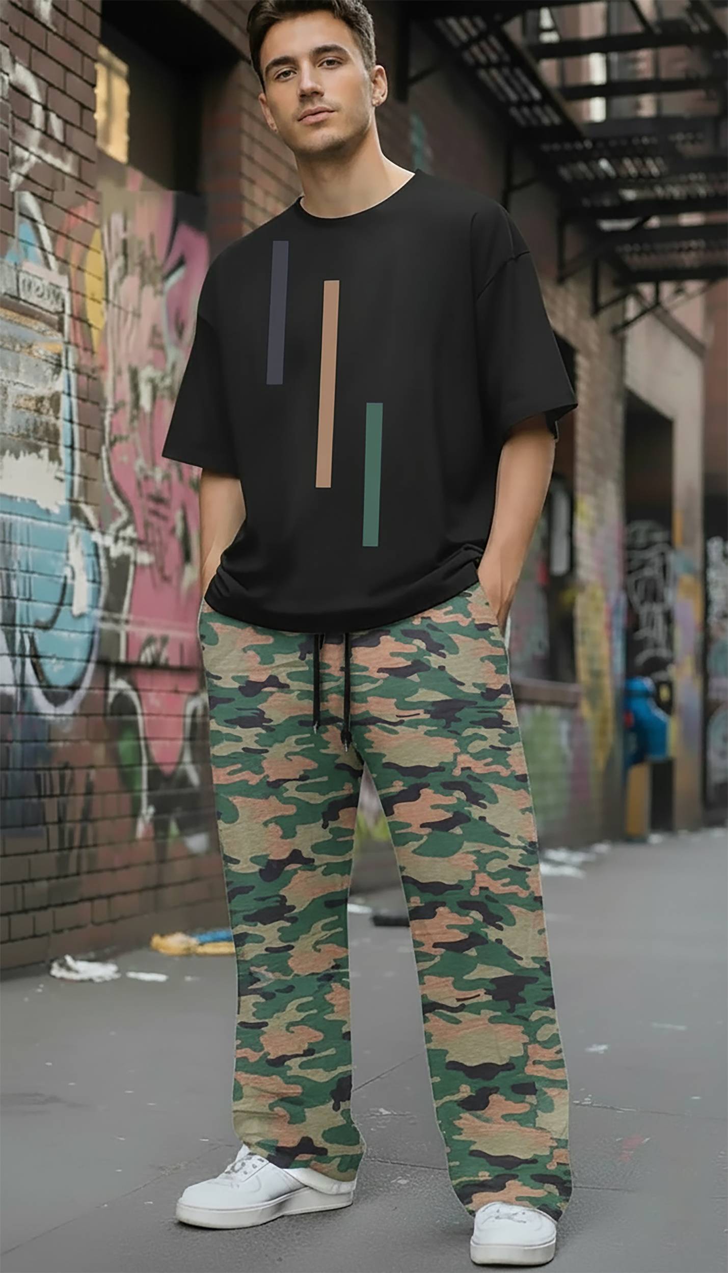The outfit shown is a men's urban streetwear look featuring a black graphic T-shirt and blue camouflage print cargo pants, paired with white sneakers.Tops: The T-shirt is a black, presumably cotton, oversized fit tee with a crew neck. It features a minimalist graphic print on the chest consisting of vertical stripes in white and blue.
