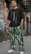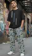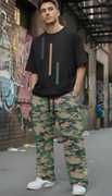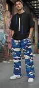 Bottoms: The pants are a baggy or relaxed fit cargo style in a blue, white, and black camouflage pattern. They have an elasticated or drawstring waistband, typical of jogger or track pants, and feature utility pockets for a functional fashion aesthetic. This combination is a versatile and stylish take on casual wear.