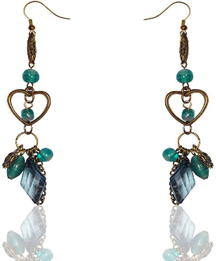 French Reverie from Dream Girl Collection is a hand made golden accented fashion earrings wherein Canton Green colour glass, Mid Night Blue accented acrylic beads, metal findings are strung on Oxidized Brass Plated Heart shaped ring .Lead Free and Nickel free Fish hooks provided. Polyurethane coated for longer lasting shine. Matching Necklace and Bracelet available. Please click at the link for matching products below.