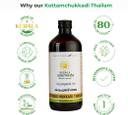 Fortified with nature's remedies, this oil contains kottam or saussurea lappa, known for its vata-pacifying and pain-relief properties. Chukku or zingibale officinale contributes anti-inflammatory benefits, aiding in the reduction of swelling. Vayambu or acorus calamus is useful in addressing vata-predominant conditions like neuralgia and paralysis. Lastly, sigru or moringa oleifera adds analgesic and anti-inflammatory properties to help combat swelling effectively.