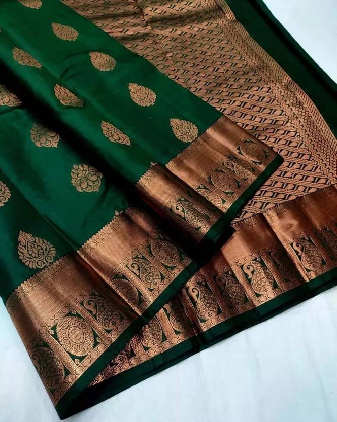 kevami fashion Woven Kanjivaram Jacquard, Pure Silk Saree (Dark Green)