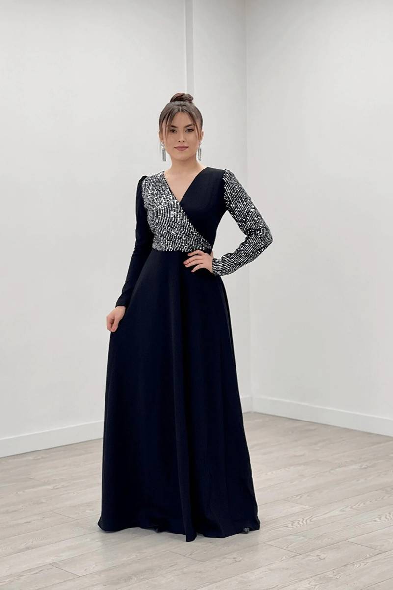Featuring an A-line cut, this gown offers a flattering and timeless silhouette that gracefully skims the body. Its V-neckline adds a structured touch to the bodice, enhancing the overall look while maintaining a graceful appeal. However, its long puffed sleeves introduce subtle volume, creating a balanced silhouette that complements various body types. With its full-length structure, this gown ensures an elegant drape, making it a stylish choice for formal occasions, evening events, or various celebrations.