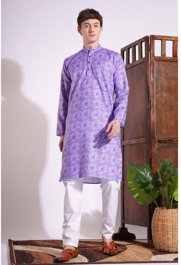 A male printed kurta is a modern and stylish adaptation of the traditional kurta, which has been a head in the South Asian wardrobe for centuries. A printed kurta mixes traditional, comfortable design with vibrant and contemporary prints, which makes versatile for festive events from casual wear for various occasions. Whether floral designs, geometric patterns, pacele motifs, or abstract art, the printed kurta offers a unique mix of comfort, fashion and cultural heritage.Kurti comes in various styles, including straight cuts, A-line and flare, and can be paired with individual bottoms such as leggings, anniversaries or jeans. They are often worn for both casual and formal opportunities, and their versatility allows them to prepare up or down with accessories, shawls, or dupattas.