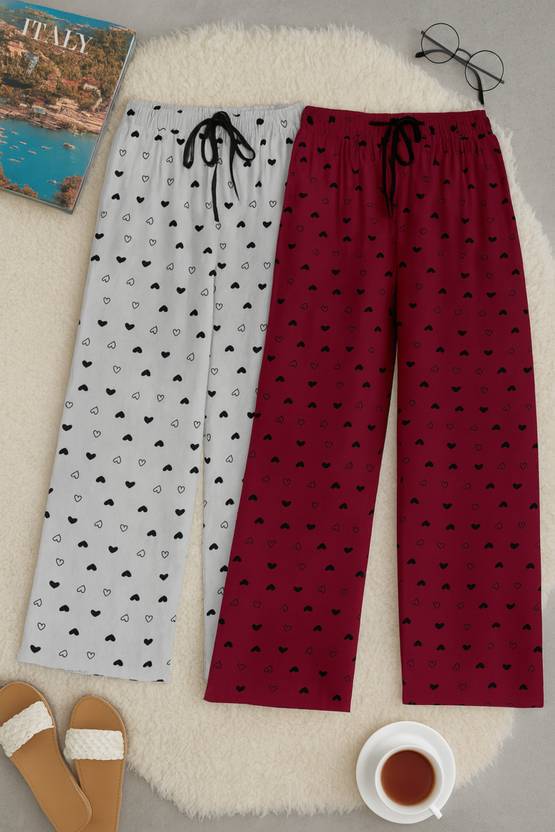 KHODALTREND Upgrade your everyday comfort with this stylish Pack of 2 Women’s Printed Pyjamas – designed for ultimate relaxation and chic casual wear. Crafted from soft, breathable cotton blend fabric, these pyjamas feel gentle on the skin and ensure all-day freshness. The trendy heart print design adds a playful touch, making them perfect for both lounging at home and stepping out in casual style.Featuring a comfortable elastic waistband with adjustable drawstring, these pyjamas provide a customized fit for every body type. The lightweight & durable material makes them ideal for nightwear, loungewear, or casual outings. Available in versatile colors they pair effortlessly with t-shirts, tank tops, or kurtis.Designed for today’s modern woman, this value pack of 2 pyjamas is perfect for daily wear, gifting, or travel essentials. Easy to wash, fade-resistant, and long-lasting – these pyjamas are a must-have addition to your wardrobe.