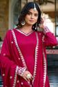 Silhouette: Flared Anarkali with full-length flow, Neckline: V-neck with embroidered border, Sleeves: Full-length sleeves with heavy embroidery at cuffs, Waistline: Empire cut, giving a graceful flare and elegant fall, Hemline: Broad embroidered border with intricate floral and geometric motifs