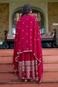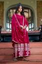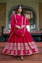 This gown is a beautiful, vibrant red ensemble featuring intricate white floral embroidery along the hem and the edges. It has a traditional design with a flowing, A-line silhouette and is paired with a matching scarf or dupatta, enhancing its elegance. The gown also includes delicate embellishments and jewelry accents, giving it a rich and festive look, perfect for cultural or celebratory occasions.