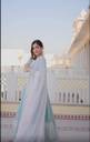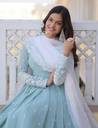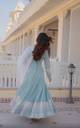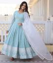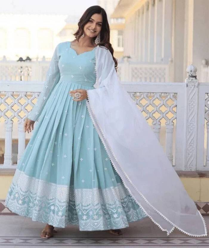Graceful sky blue ethnic gown featuring delicate embroidered motifs and a beautifully flared silhouette. Paired with a soft white dupatta, this elegant outfit is perfect for festive occasions, weddings, and special celebrations.