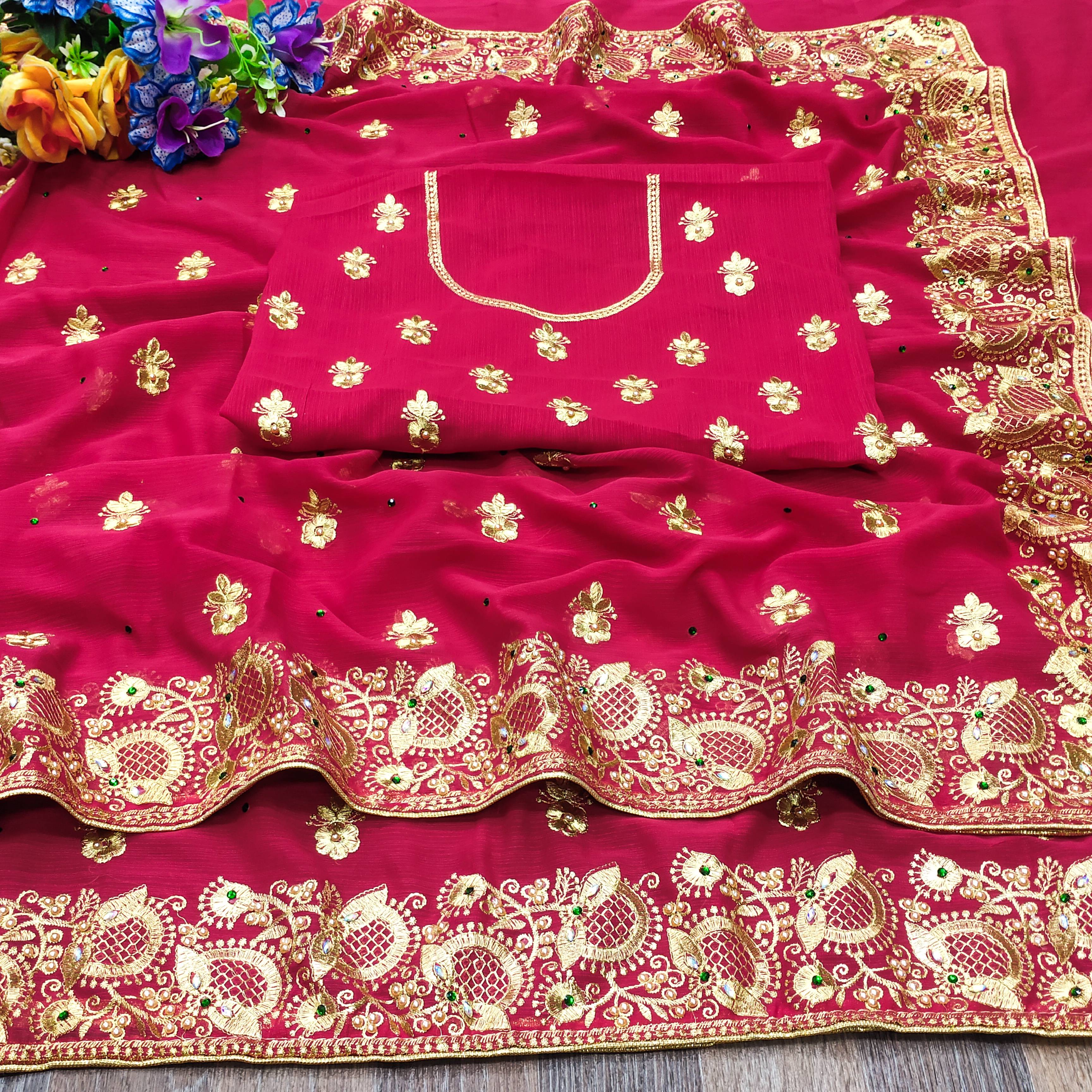 This Saree Made With Georgette Fabric With 5.4 Meter Length. You Will Enhance Your Look.We Also Attached Diamond Work in this Saree. Fabric Is best Quality,we Attached Blouse in this saree which is 0.8 meter.Blouse Is tottaly unstiched So you will stiched it according to your Size.You Also use this saree For Daily Wear At home And Partywear .Sometimes You Will use it For Festival Seasson.After Wearing this Saree You will Feel Something New So dont miss it.