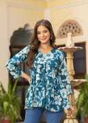Courtesy of its adaptable design, this kurti can be worn with oxidised earrings and heels. The graceful look fits seamlessly into wedding functions, where traditional touches feel welcome. A weekend outing also feels complete when styled with this kurti and casual footwear. Festive plans or housewarming ceremonies gain charm through its vibrant detailing. Pairing it with jeans, palazzos, or shararas allows styling to shift easily between moods.
