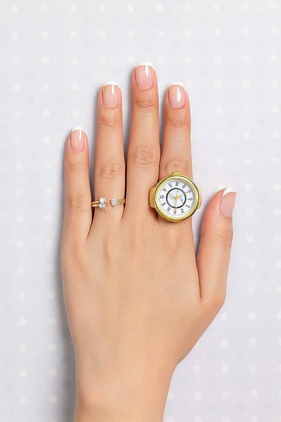 Khushana Jewellery presents a stylish gold-plated ring watch with a white dial. Adjustable, lightweight, and trendy – perfect for women & girls for parties, weddings, and daily wear.