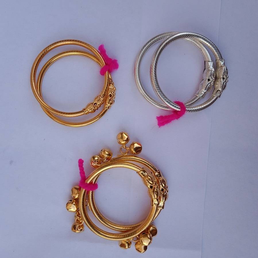 bangale Silver gold ghunghru Plated Plain kada Simple Sober Fixed bangale Nazariya new Born baby Kids (0-9 month)Nazariya kada new born Baby boy girls bangale set Nazariya evli eye - Pack of 3 pair Inside image combo pack