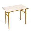 Key Features | - Elegant Golden Legs – sturdy powder coated steel legs in luxurious gold that add visual appeal and modern looks, Multi Functionality – capable of serving as a study table, office desk, laptop table, computer workstation, ironing board, or intimate dining surface, Anti Slip & Floor Friendly Feet – equipped with rubber or adjustable base caps to prevent slippage and protect surfaces in busy environments such as offices and restaurants., Portable Yet Robust Design – despite its solidity, the table is light enough to move or fold, making it perfect for on the go events, exhibitions, or dynamic workspaces., Durable & Load Bearing – crafted from solid steel legs and thick board material to support daily workloads, electronics, meals, or even irons., Stylish Marble-Look Table Top - The premium faux-marble finish adds a touch of elegance while being resistant to scratches, stains, and heat., Easy to Clean Surface - Wipe-clean laminate surface ensures low maintenance even after meals, crafting, or ironing.