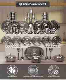 6 Dinner Plates - 11", 6 Quarter Plate - 7.5", 6 Vegetable Bowls(katori) - 6" (200 ml), 6 Dish Bowls(Halwa plate) - 5.5" (150 ml), 6 Chutney Katori - 3" (100 ml), 6 Glasses - 250 ml, 6 Spoons - 16 cm, 6 Forks - 16 cm, 4 Serving Spoons - 21 cm, 3 handi (1000ml, 750ml, 500ml), 3 Lid, 3 Puri Dabba - 8"-11" (350 ml, 500 ml, 750 ml), 1 Jug (1500 ml), 1 Rice Spoon - 23 cm, 1 Rice Plate - 30 cm.