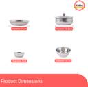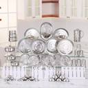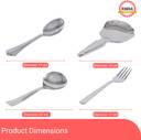 6 Dinner Plates - 12", 6 Quarter Plate - 7.5", 6 Vegetable Bowls(katori) - 6" (200 ml), 6 Dish Bowls(Halwa plate) - 5.5" (150 ml), 6 Chutney Katori - 3" (100 ml), 6 Glasses - 250 ml, 6 Spoons - 16 cm, 6 Forks - 16 cm, 4 Serving Spoons - 21 cm, 3 Donga With Lid - 9" (650 ml), 3 Puri Dabba - 7"-9" (250 ml, 500 ml, 750 ml), 1 Jug (1500 ml), 1 Rice Spoon - 23 cm, 1 Rice Plate - 30 cm, 2 Salt N Pepper