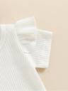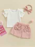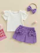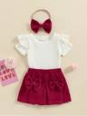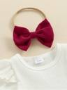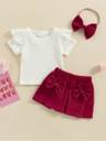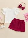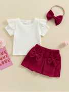This charming toddler outfit set includes a crisp white ribbed top with delicate ruffled sleeves, paired with a rich burgundy skirt featuring elegant bow details. The set is completed with a matching burgundy bow headband, adding a touch of sweetness. Perfect for everyday wear or special occasions, this comfortable and stylish ensemble is a delightful choice.