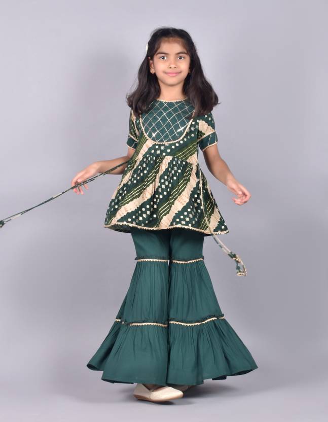 Misbis Girl's Printed Rayon Gotta work on yoke Printed kurta and Latkan in Side ||Solid Sharara with Gotta Work || Round Neck || Gotta on Short Sleeve || Rayon Fabric || Its Ready to Wear Girl's Party wear kurta set || Best suitable for all occasion like wedding, ceremonial, party, birthday, festival || Best Birthday Gift for Girls.