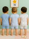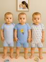 Keep your little one stylish and comfortable with this pack of 3 knee-length baby dungarees. Made from 100% soft cotton, these rompers are gentle on delicate skin and perfect for daily wear. The pack includes one solid color dungaree with a cute "Little Star" chest print, one all-over star printed dungaree, and one blue-striped dungaree — offering a variety of looks for any occasion. Each romper features short sleeves, round neck, and snap button closure at the bottom for easy diaper changes. These dungarees are designed to provide a perfect fit and freedom of movement for your baby while ensuring breathability and comfort all day long.
