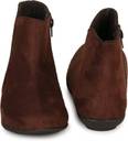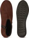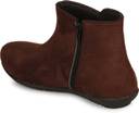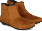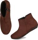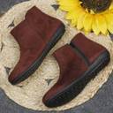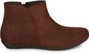 An ankle boot with a flat sole. It appears to be made of a soft material, suede synthetic fabric. The boot has a rounded toe and a zipper closure on the inner side of the ankle. The design is simple and minimalist, with clean lines and no prominent decorative features. The sole is thin, black, and has a slight texture. The overall look is casual and comfortable.