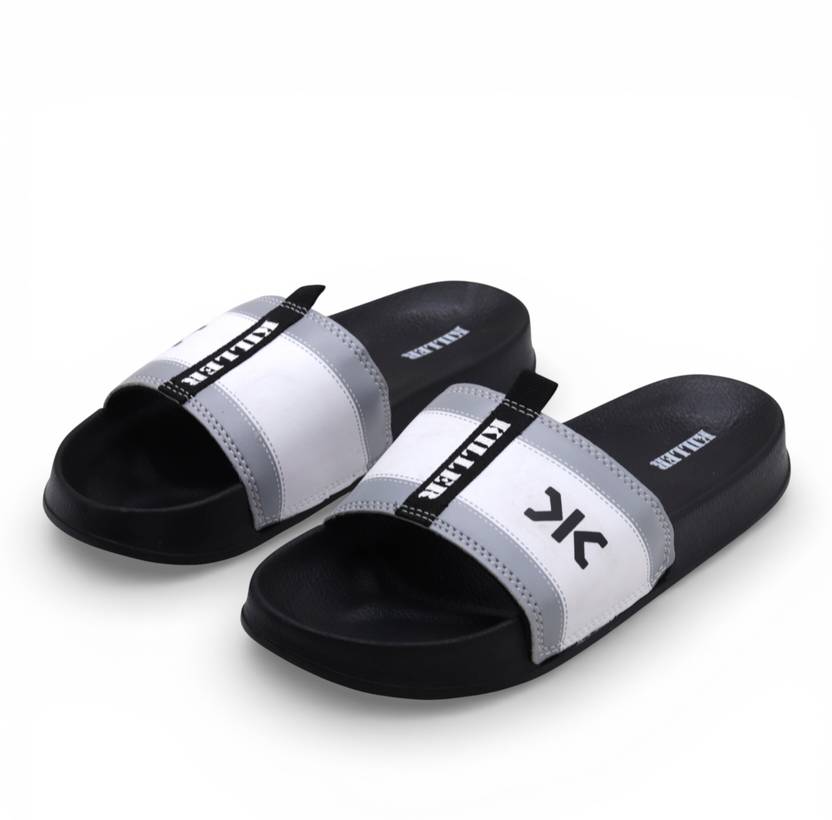 These KILLER slides feature a wide upper strap that offers a secure and comfortable fit for daily wear. The cushioned footbed provides softness and support, helping reduce foot fatigue during extended use. A textured sole improves grip and stability on different surfaces, making them suitable for both indoor and outdoor use. Lightweight and easy to slip on, these slides pair well with shorts, track pants, lounge wear, and other casual outfits, making them ideal for everyday comfort, travel, and relaxation.