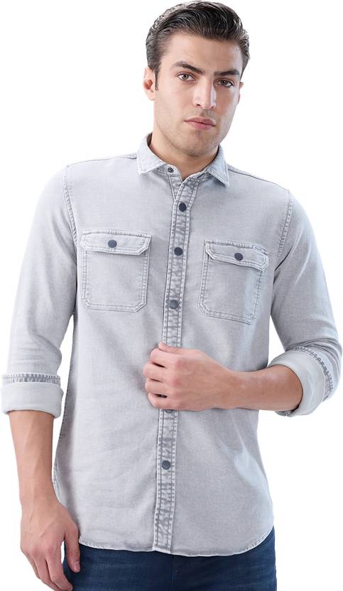 Killer Mens Light Grey Indigo Slender Fit Solid Full Sleeve Denim Shirts