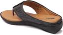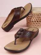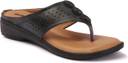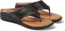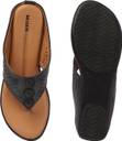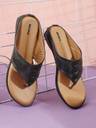 These women's flat sandals feature a classic thong-style design with a broad black upper strap. The strap is adorned with delicate laser-cut perforations and three small, circular floral embellishments, adding a touch of elegance. The comfortable tan footbed contrasts with the black upper and sole, providing a stylish look. The sandals have a low, flat profile, making them ideal for everyday wear. They can be paired with casual dresses, skirts, jeans, capris, and various ethnic outfits such as kurtis and salwar suits.