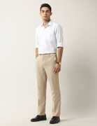 The sleek beige tone exudes sophistication, pairing effortlessly with a variety of shirts and blazers. Featuring a flat-front design, sharp creases, and precise stitching, these trousers strike the perfect balance between timeless style and contemporary appeal. The waistband includes belt loops for added versatility, while the secure button and zip closure ensure a snug yet comfortable fit.