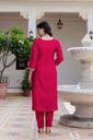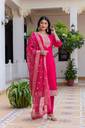 Add elegance to your wardrobe with this stunning Roman fabric kurti set. Crafted from premium-quality Roman fabric, this outfit offers a smooth texture, rich color, and a graceful fall. The kurti features intricate embroidery on the neckline and sleeve edges, paired beautifully with a matching pant and a gorgeous woven dupatta. The vibrant pink hue and delicate detailing make it perfect for festive occasions, family gatherings, or traditional events.