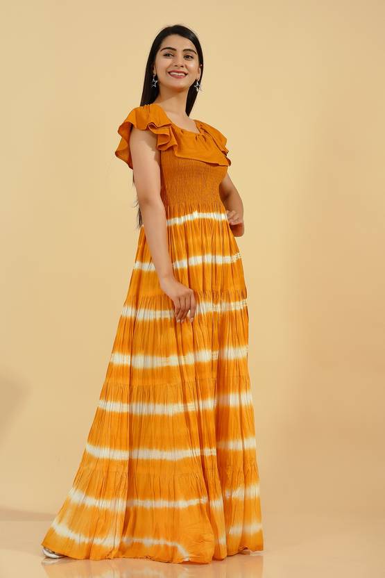 An amazing range of womens ethnic wear in soft and solid colors that looks perfect for regular wear. With beautiful designs and patterns. These apparels are very stylish and comfortable too. Get rid of the regular look this season wearing Kurta by Kipek. This Mustard Flared Tie die Kurta from Kipek exhibits Stretchable from waist,rufflerd neck along with Square neck & Half sleeves. Tailored from Cotton. Product Length: 30 Inches.