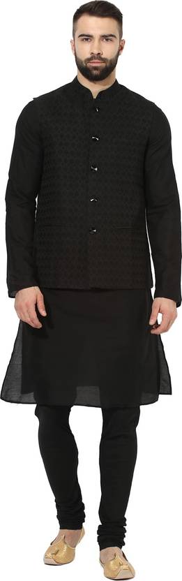 This unique Kurta Pyjama and Nehru jacket combo are ideal for weddings and occassions. Exquisite and charming, this set from Kisah is best worn with embellished mojaris. With two welt pockets in front, this Nehru jacket is fully lined and has a banded collar. The churidar has a waistband with a drawstring fastening on the front. kurta, has a mandarin collar, long sleeves, insert pockets on the side seams, and side slits.
