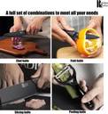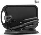 The Kitchencrafter Premium Kitchen Knife Set with Stand is the ultimate kitchen companion, offering everything you need for efficient meal preparation in one sleek and durable package. This 7-piece knife set for kitchen includes a chef knife, cleaver knife, multipurpose utility knife with a built-in fish scale remover, kitchen scissors, peeler, cutting board, and a PP stand for safe, organized storage. Each knife is made from high-carbon stainless steel, renowned for its rust resistance, long-lasting sharpness, and durability. The black BO Oxide coating further enhances protection against wear and corrosion, ensuring that the knives remain sharp and reliable over time. The chef knife and cleaver knife feature a non-stick, food-safe coating, which not only ensures easy food release during cutting but also makes cleaning easier. Whether you're slicing through tough meats, chopping vegetables, or filleting fish, this sharp knife set handles all tasks with ease and precision. The knives and kitchen scissors in this knife set with stand are equipped with soft, ergonomic PE handles, designed to provide a comfortable, non-slip grip, even during long use or in wet conditions, reducing hand fatigue and enhancing control. The utility knife comes with a built-in fish scale remover, while the multifunctional kitchen scissors include a bottle opener, walnut cracker, and sharp blades, making them versatile enough to handle a wide variety of kitchen tasks. For added convenience and safety, the kitchen knife set comes with a PP stand and blade guards, ensuring that your knives, scissors, and cutting board are stored safely and neatly, keeping your kitchen organized and promoting hygiene. The included cutting board with handle offers a sturdy surface for prep work, protecting your countertops from scratches. Whether you're a home cook preparing daily meals or a professional chef working with complex recipes, this chef knife set is designed to meet all your culinary needs. The Kitchencrafter Premium Kitchen Knife Set combines durability, functionality, and style, offering high-quality stainless steel knives, a versatile design, and organized storage, making it the perfect choice for any kitchen.