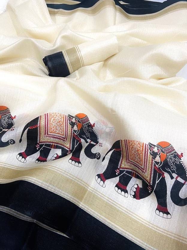 Kjs Printed Ikkat Cotton Blend Saree (Cream)