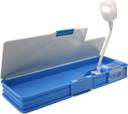 Comes with two compartments that have magnetic closure making it easy to use.Is made of good quality plastic that makes it durable and with INTEGRATED LAMP AND SHARPENER