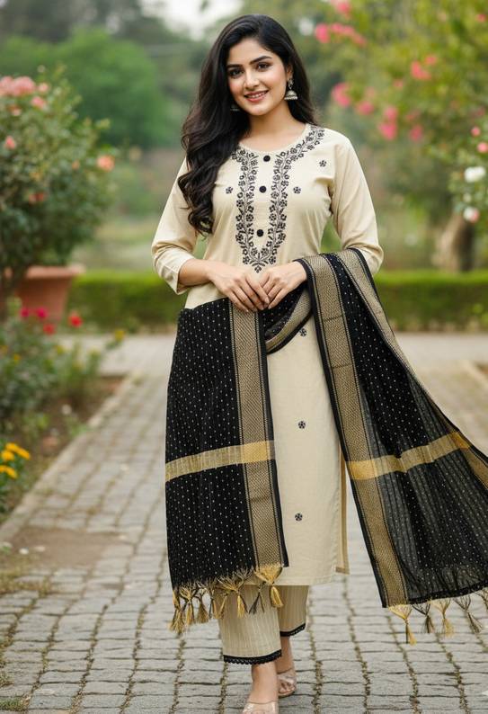 Women Khadi Cotton Kurti Pant Dupatta Set