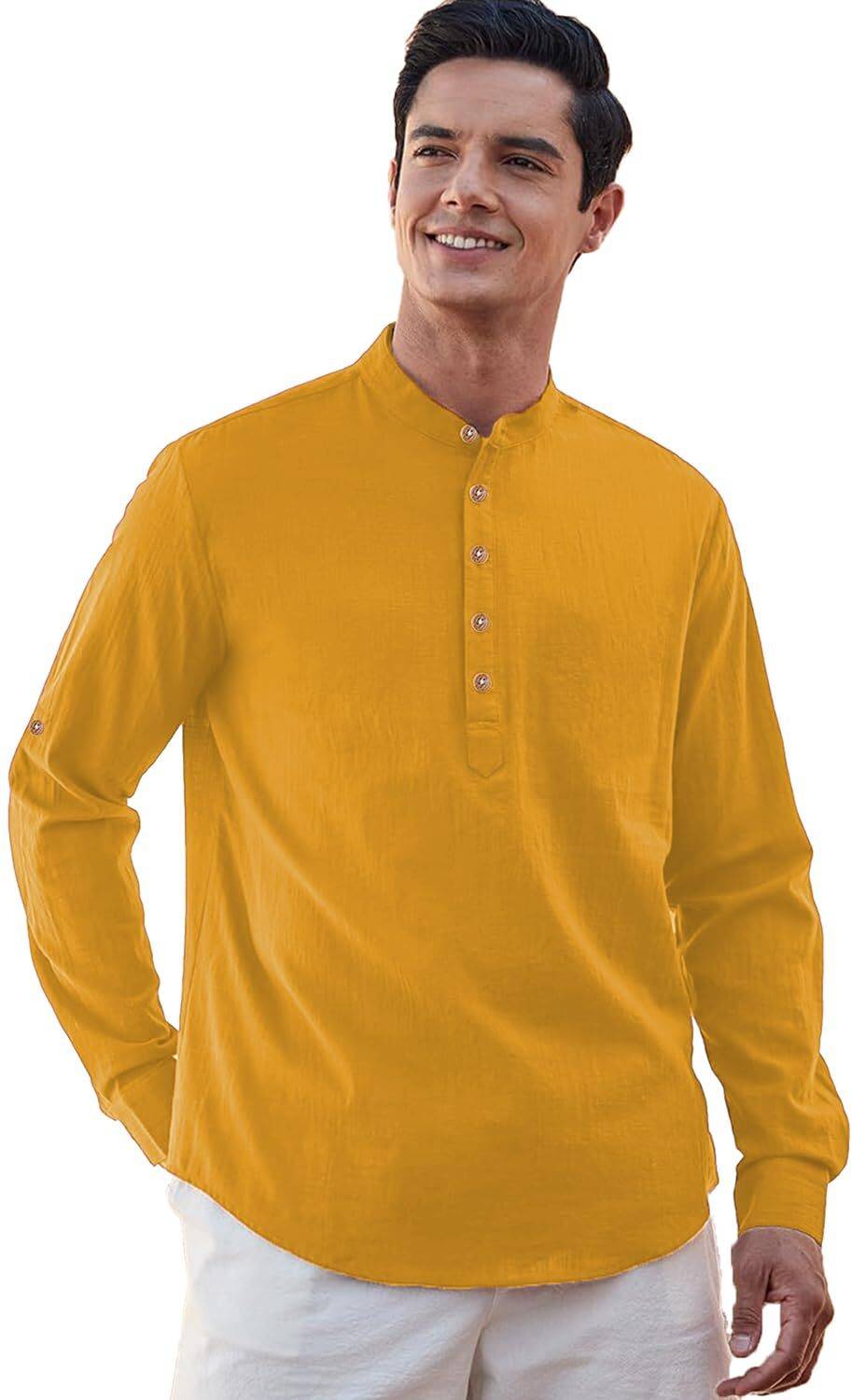 Men Solid Cotton Blend Straight Kurta (Yellow)
