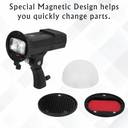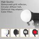 Circular Diffuser X 1, Gel Holder X 1, Honeycomb Grid X 1, Magnetic Holder X 1, Multi Color Gels X 4