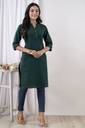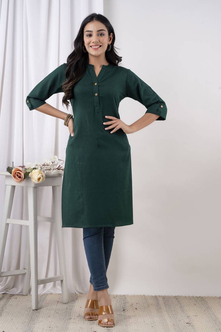 An amazing range of womens western wear & ethnic wear in soft and solid colors that looks perfect for regular wear. This Green Floral Print Straight Kurta from Kohsh exhibits Front Button Detail on Placket with Roll Up Sleeve along with Mandarin Collar & 3/4th Sleeves. Tailored from Cotton Flex. Product Length: 38 Inches.