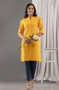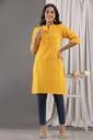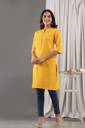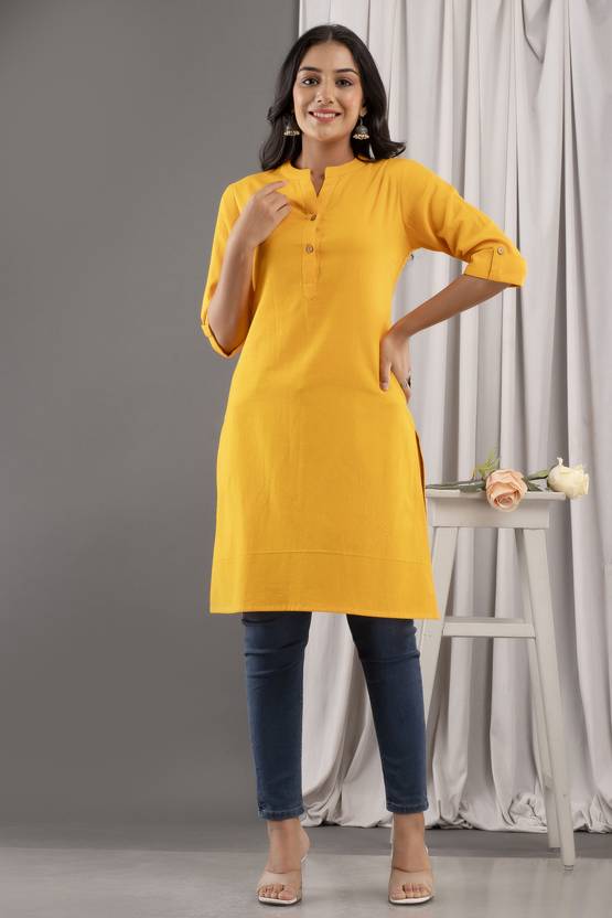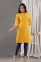 An amazing range of womens western wear & ethnic wear in soft and solid colors that looks perfect for regular wear. This Yellow Floral Print Straight Kurta from Kohsh exhibits Front Button Detail on Placket with Roll Up Sleeve along with Mandarin Collar & 3/4th Sleeves. Tailored from Cotton Flex. Product Length: 38 Inches.