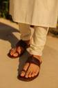 Formal Look: For semi-formal gatherings, wear men Kolhapuri sandals in polished leather shades with linen trousers and shirts.