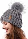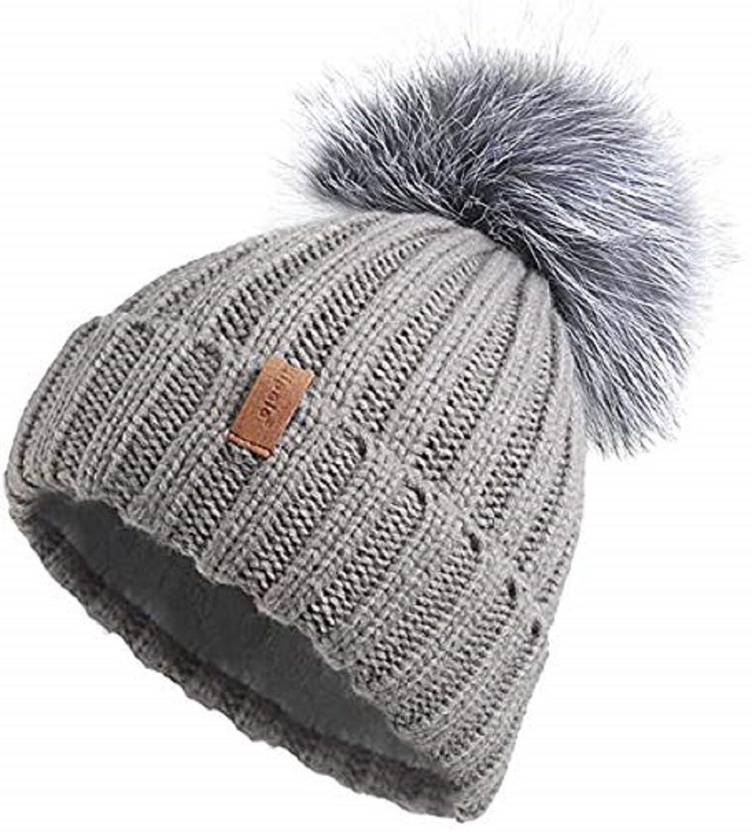 Knit Beanie Hats for Women Fleece Lined with Real Fur Pom Pom Winter Hat (Grey)