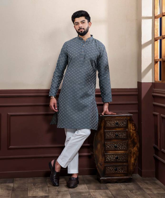 Elevate your festive and wedding wardrobe with the Koshin Men's Gray Cotton Woven Print Kurta, featuring full sleeves and a sophisticated mandarin collar. Crafted from premium cotton, this kurta ensures comfort and breathability, making it perfect for long celebrations. The intricate woven print adds a touch of elegance, while the accompanying white solid cotton pyjama completes the ensemble with a classic contrast. Designed for the modern man who values tradition and style, this kurta set is a versatile addition to any occasion, offering a perfect blend of contemporary design and timeless appeal. Stand out effortlessly with Koshin's impeccable craftsmanship.