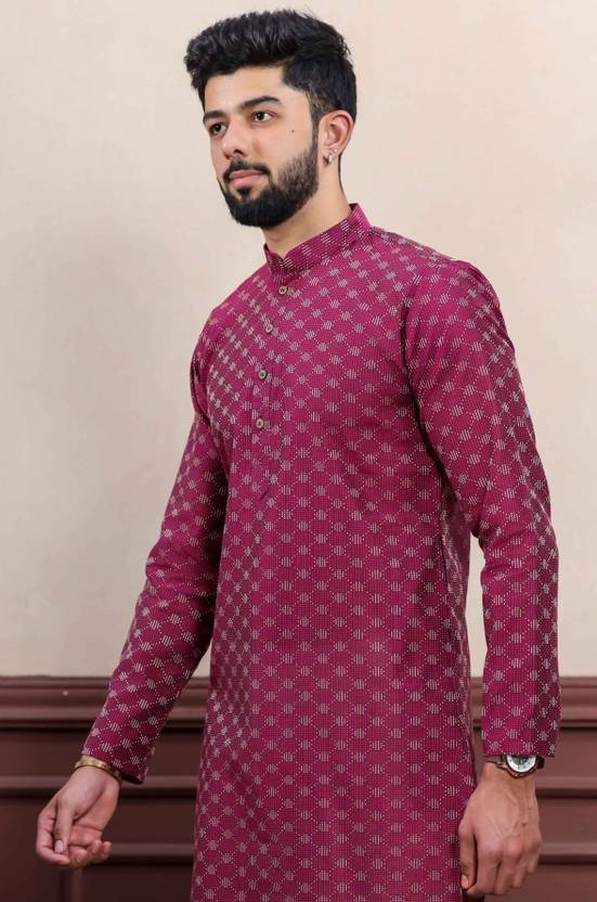 Koshin Men's Purple Cotton Woven Print Kurta with White Solid Pyjama