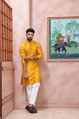 This set of pyjama and kurta in yellow shade looks amazing for every traditional function. Quality wise best material used in making of this kurta product. Liked the simple pattern and yellow shade so much.