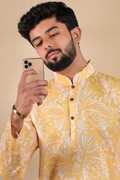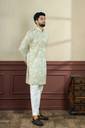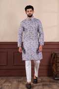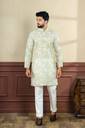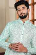 Elevate your style with Koshin Men's Pista Pure Linen Kurta, featuring ethnic digital prints, full sleeves, and a mandarin collar. Paired with classic white solid pants, this ensemble offers comfort and sophistication for any occasion.