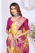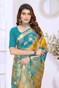 Material: The sari is made from art silk, which is a synthetic or artificial silk fabric. It is designed to resemble the texture and shine of real silk while being more affordable and easy to maintain.
