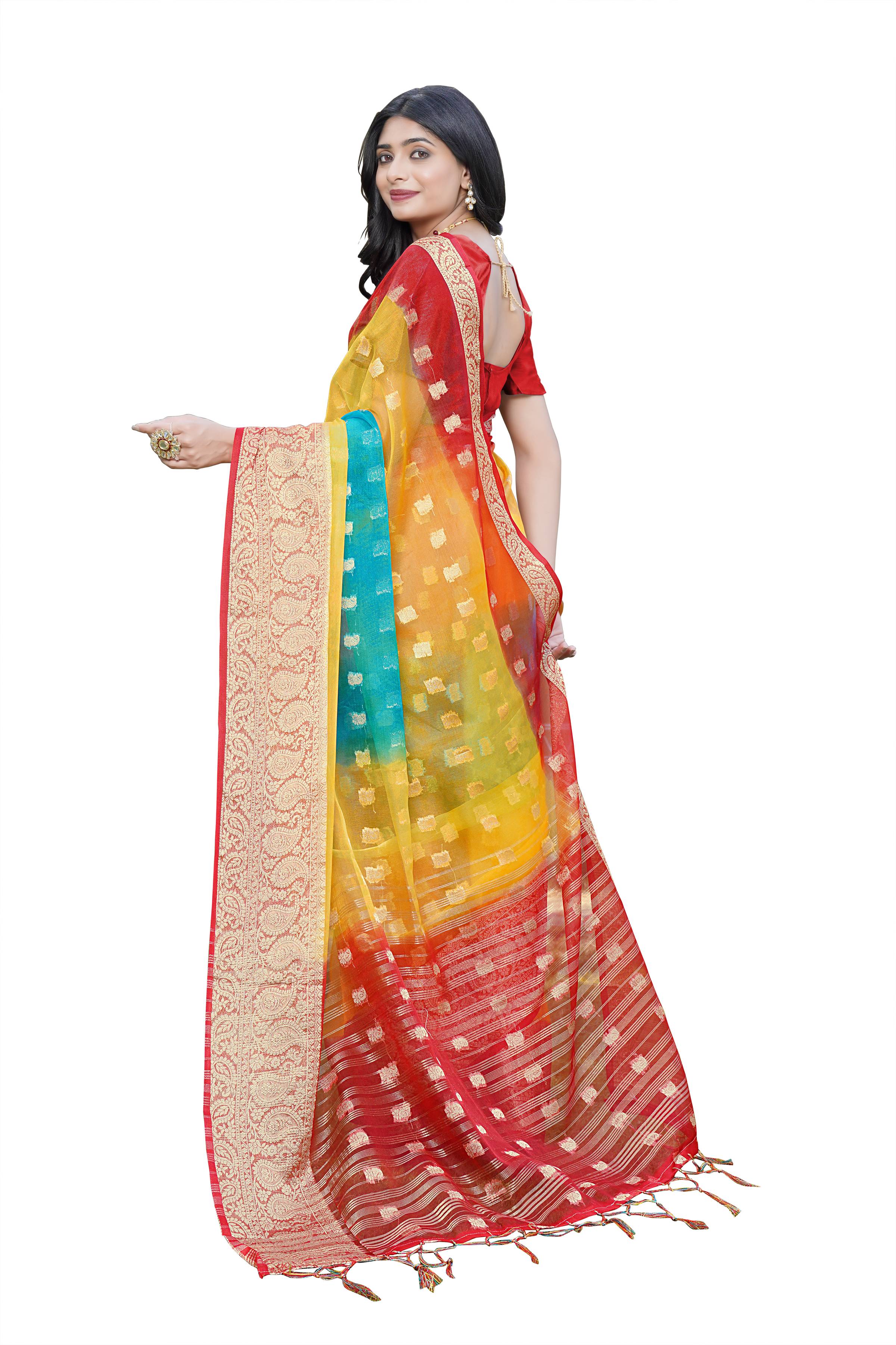 Material: The sari is made from art silk, which is a synthetic or artificial silk fabric. It is designed to resemble the texture and shine of real silk while being more affordable and easy to maintain.
