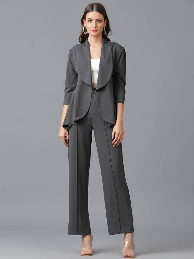 Be the epitome of class and grace donning this grey cord set from kotty. Crafted from polyester, this set features a spread collar blazer and pant set with an button closure waist. The cord set is also modeled with full sleeves.Kindly ensure the size chart before buying.