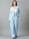 Be the epitome of class and grace while donning this light blue cord set from kotty. Crafted from viscose rayon , this set features a spread collar blazer and pant set with an button closure waist. The cord set is also modeled with full sleeves.Kindly ensure the size chart before buying.