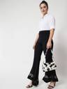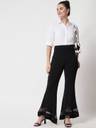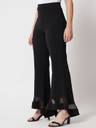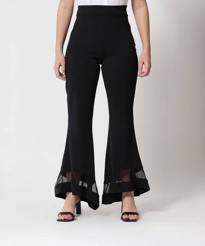 Give your regular look a stylish makeover with these black pants from Kotty. These smart high rise pants features a charming flared fit beautifully design with net,regular length. Made from polyster fabric, they will become one of your favorites this season. You can team them with a top to complete your look.